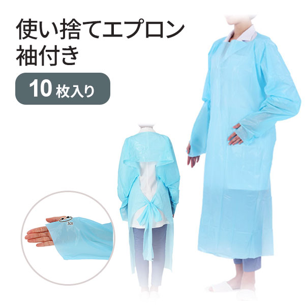 使い捨て エプロン 袖付き フリーサイズ ブルー 10枚入 [ 個別包装 使い切り ビニール ディスポ エプロン 防水 男女兼用 作業用 介護用エプロン お食事エプロン 食事用 業務用 介護 食事 清掃 ポリエチレン 耐薬品性 ]