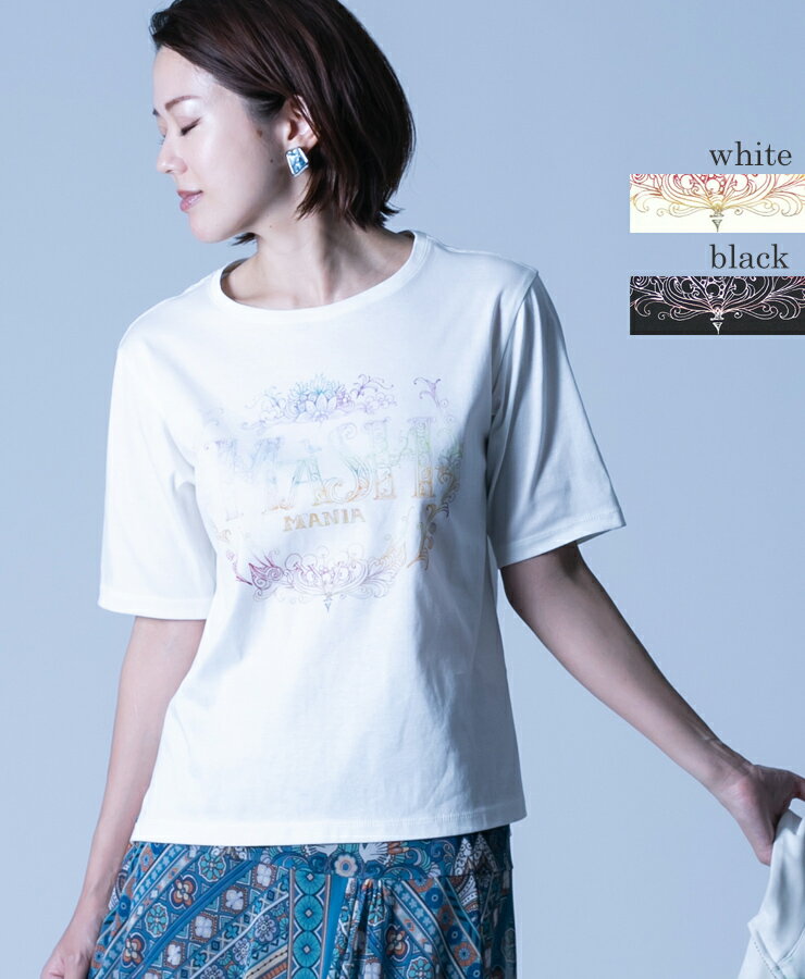 【SALE 30%OFF】mash mania コットンTシャツ Mashロゴ/ レディース 日本製 洗える トップス 半袖 裾スリット ロゴ 植物柄 綿スムース 綿100% コットン ホワイト ブラック マッシュマニア