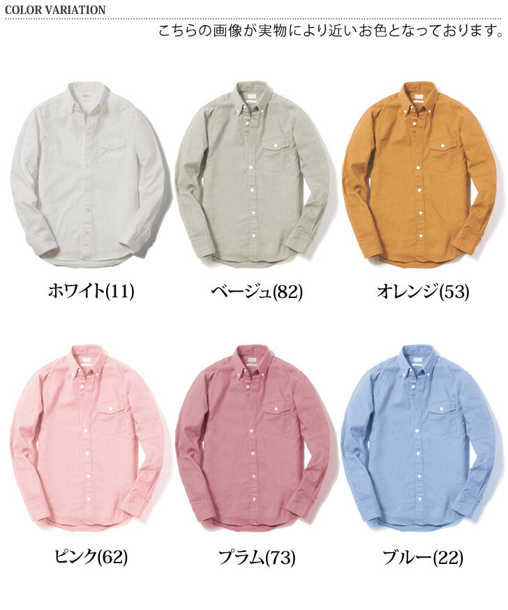 シンプルなボタンダウンシャツは幅広く着こなせる優秀アイテムです! ■サイズ:M・L・XLの全3サイズ■カラー:ホワイト(11)・ベージュ(82)・オレンジ(53)・ピンク(62)・プラム(73)・ブルー(22)・ダークブルー(24)・ブルーグレー(12)・ライトグリーン(33)・グリーン(34)・ネイビー(28)・ブラック(19)・ダークグレー(15)■重さ:300g■生産:日本製 素材 綿100% 生地感 【伸縮性】なし【透け感】なし(ホワイトはややあり) サイズ 肩幅(cm) 袖丈(cm) 身幅(cm) 着丈(cm) M 42 62 46 67 L 44 64 49 70 XL 46 65 51 73 上記サイズ表はスタッフが採寸し、製品の実寸を掲載しております。